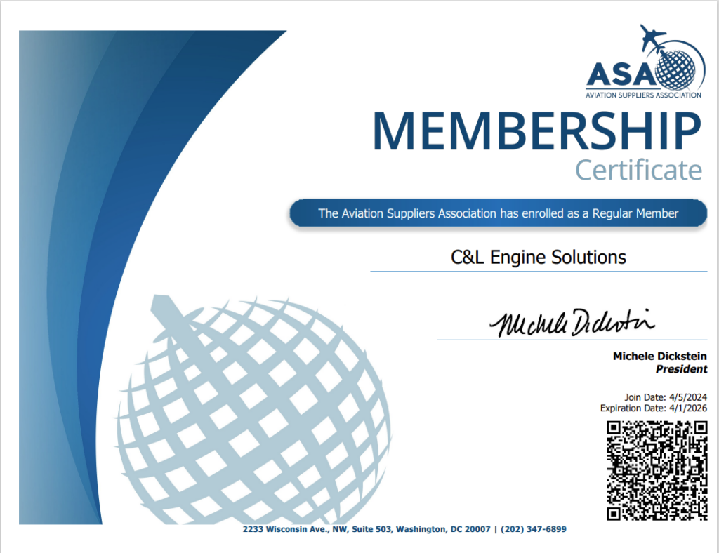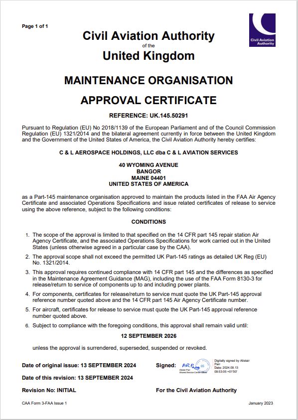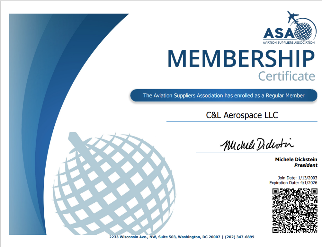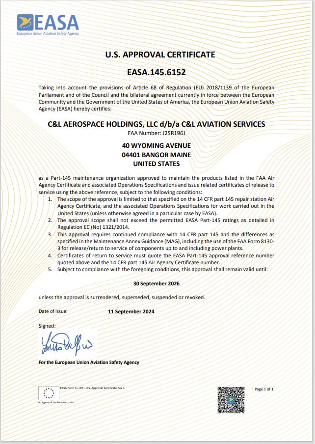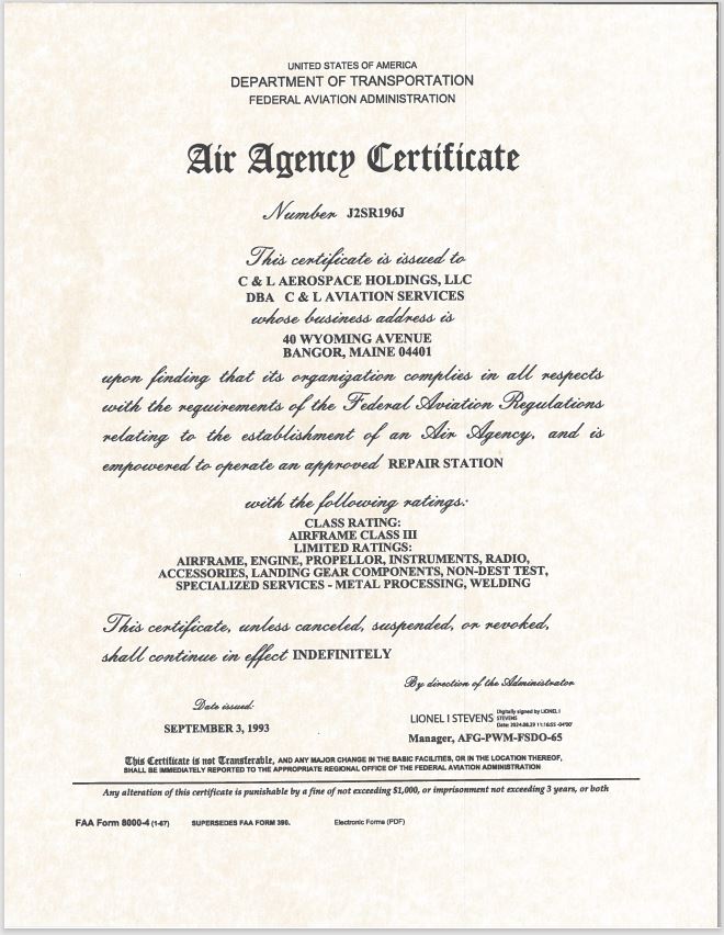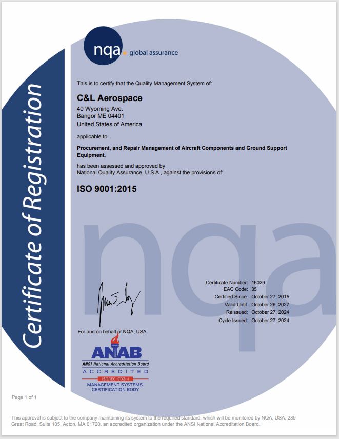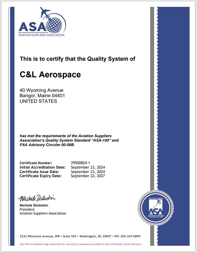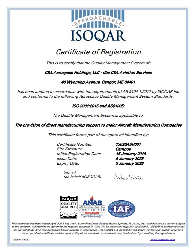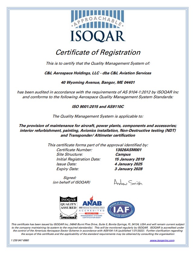 C&L Aerospace is ISO-9001:2015 certified. C&L Aviation Services is also ISO-9001:2015 certified and AS9110C and AS9100D. C&L Aviation Services is an FAA Part 145 approved repair station (Number J2SR196J) and also has EASA Part 145 approval.